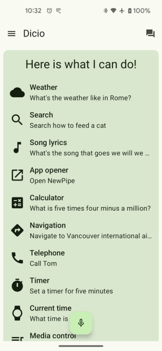 • I could not get Dicio to launch another app. I suspect this is due to what I call Android Upgrade Blight: Google keeps changing APIs and restricting permissions of apps in the name of security for each Android release, and it is hard for developers to keep up with changes. Starting in Android 14, Google added an explicit opt-in permission requirement in order to allow launching of apps.