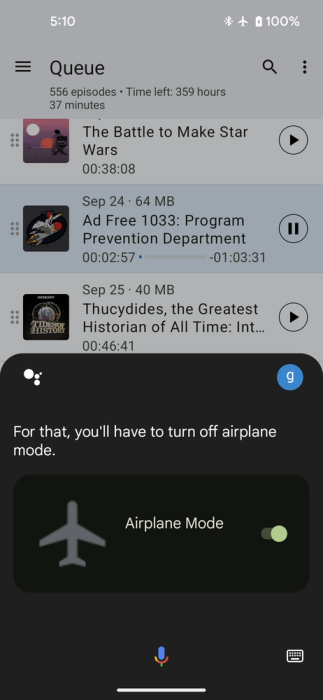 What’s worse, Google Assistant will not work in Airplane mode, at least not at the time of this writing, and on my Pixel 5. It interprets the “Hey Google” wake-word just fine, but will not carry out a command. Something odd is going on here. When in Airplane mode Google Assistant recognizes my speech command just fine:
