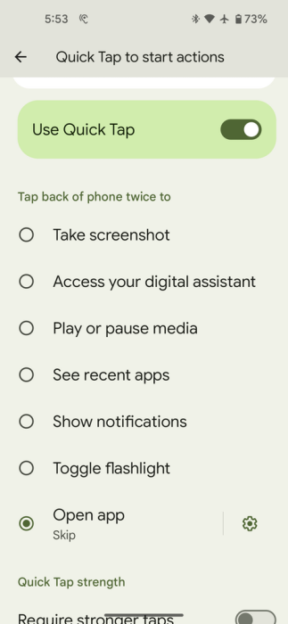 After enabling Google Assistant on my phone, I noticed the app is very good at recognizing my voice for wake-words and following commands. However, there is a timing gap before receiving the beep acknowledging the wake-word and ready to receive a command. The whole cycle of saying the wake-word, waiting for the beep, saying the command “skip audio” or “launch Skip”, and waiting for the command to be interpreted is a few seconds, not ideal when you might have to skip several minutes of a podcast commercial break. Assistant is supposed to have a “Quick phases” feature, where you can skip the “Hey Google” wake-word for certain frequently-used commands, but that feature works with Pixel 6 or later, and I have a Pixel 5.