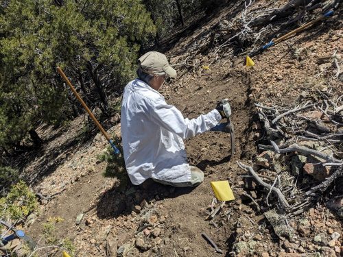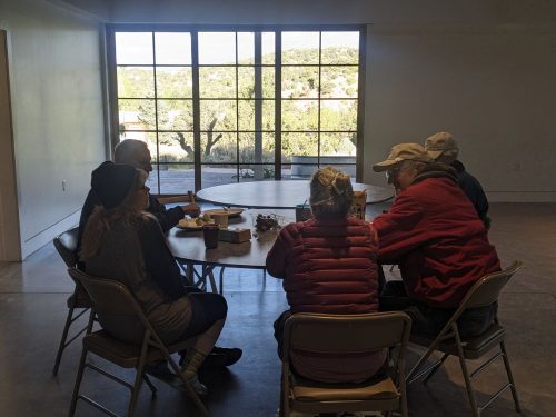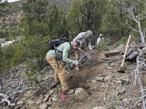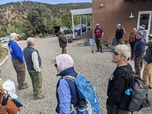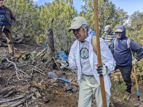 16 NMVFO volunteers gathered for a weekend car-camp project at the Randall Davey Audubon Center in Santa Fe, to build 0.2 miles of new trail, previously flagged by Jenny.